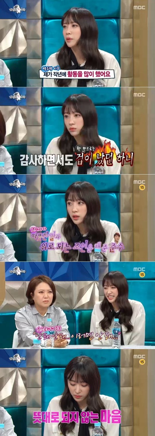 하니는 13일 밤 방송된 MBC 예능프로그램 ‘황금어장-라디오스타’ 심(心)스틸러 특집에서 “지난해 활동을 많이 했다. ‘라디오스타’ 같이 TV로만 보던 프로그램에도 출연할 수 있었다. 그런데 활동하면서 감사하면서도 겁이 나더라”고 털어놨다.