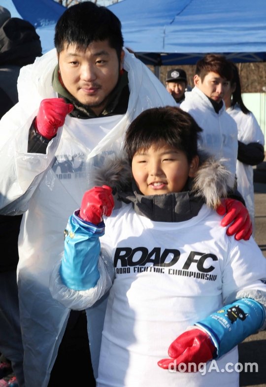 파이터 권아솔(왼쪽)이 14일 오전 서울 강남구 구룡마을에서 열린 ‘팬들과 함께하는 사랑의 연탄 나눔 봉사’에 참석해 파이팅 포즈를 취하고 있다.