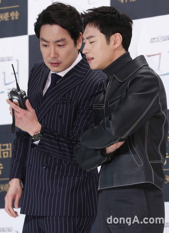 배우 조진웅(왼쪽)과 이제훈이 14일 오후 서울 영등포구 타임스퀘어에서 열린 tvN 새 금토드라마 '시그널' 제작발표회에 참석해 포토타임을 하고 있다.