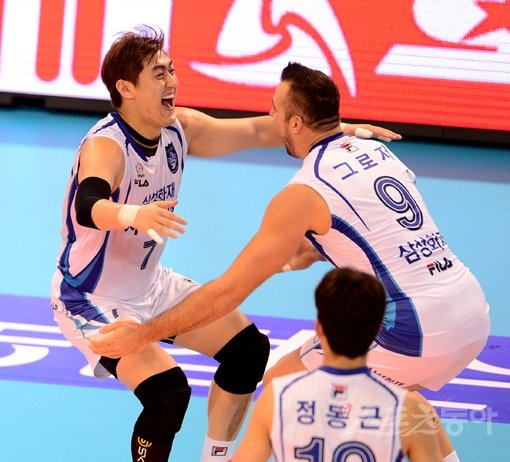 배구는 서로의 신뢰를 바탕으로 하는 경기다. 세터는 공격수를, 공격수는 세터를 믿어야 득점확률이 높아진다. 삼성화재 유광우(왼쪽)와 외국인선수 그로저는 13일 대전 충무체육관에서 열린 우리카드와의 홈경기에서 이를 입증했다. 스포츠동아DB
