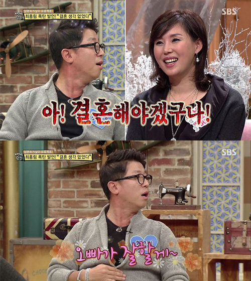 이날 방송에서 최홍림은 “결혼 전 처가에 점수 따려고 굉장히 노력을 많이 했나?”라는 MC 김원희의 물음에 “나는 처가에 잘 보이려고 하지 않았다. 왜냐면 아내하고 결혼하고 싶은 생각이 없었기 때문. 당시 내 나이가 마흔 이었는데 굳이 뭐 한 여자한테 얽매고 싶지 않았다”고 답했다.