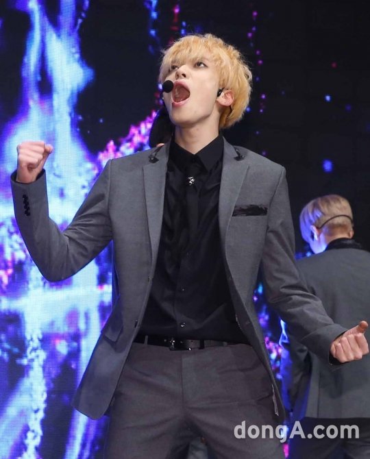 그룹 틴탑의 니엘이 18일 오전 서울 강남구 일지아트홀에서 열린 앨범 ’RED POINT(레드 포인트) 발매 쇼케이스에서 화려한 무대를 선보이고 있다.
