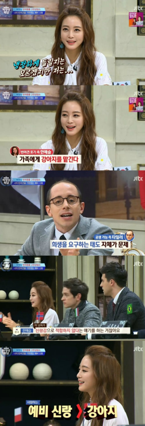 18일 방송된 JTBC 예능프로그램 ‘비정상회담’에서는 한예슬이 게스트로 등장해 각국 대표들과 반려동물에 대한 이야기를 나누었다.