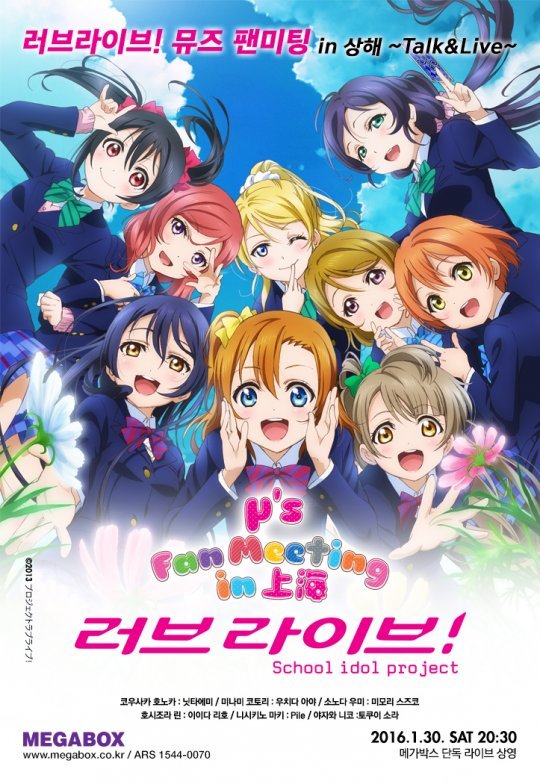 중국 상해에서 펼쳐지는 ‘러브 라이브’의 이번 팬미팅은 일본, 홍콩 등에 생중계되며, 국내에서는 메가박스 6개 지점(동대문점, 신촌점, 분당점, 해운대점, 대전점, 광주점)에서 1월 30일(토) 오후 8시 30분부터 생중계 된다.