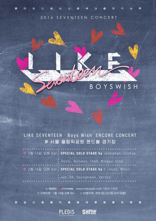 세븐틴의 소속사 플레디스 엔터테인먼트는 "내달 13일과 14일 올림픽공원 내 SK올림픽핸드볼경기장에서 개최되는 세븐틴의 'LIKE SEVENTEEN - Boys Wish' 앙코르 콘서트 티켓 예매가 인터파크를 통해 진행되었다”며 “티켓이 오픈 되자마자 온라인 주요 포털사이트 실시간 검색어에 세븐틴의 이름이 오르는 것은 물론 7,000석 규모의 좌석이 5분만에 전석 매진을 기록하는 모습을 보여주었다”고 밝혔다.