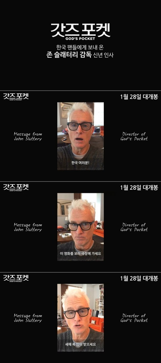 이어 존 슬래터리 감독은 자신감 있는 목소리로 “한국에서 1월 28일에 제 영화 ‘갓즈 포켓’이 개봉한다는 소식을 들었습니다. 이 영화를 보러 극장에 가세요. 한국 분들은 모두 1월 28일에 (극장에) 가서 ‘갓즈 포켓’을 보셨으면 해요. 이 영화를 좋아하게 될 테니까요. 1월 28일, 영화 표를 사세요. 여러분들 가족을 위해서요. 어린아이들은 안 되겠지만요. 그렇게 하신다면 분명 만족하실 겁니다”라고 당부했다. 장난스러운 표정과 제스처로 말을 이어가던 그는 이어 진지한 목소리로 “전 이 영화가 매우 좋고 자랑스러워요. 감사합니다. 새해 복 많이 받으세요.”라며 자신의 첫 감독 데뷔작인 ‘갓즈 포켓’에 대한 애정을 숨김없이 드러냈고, 2016년 새해 인사도 잊지 않았다.