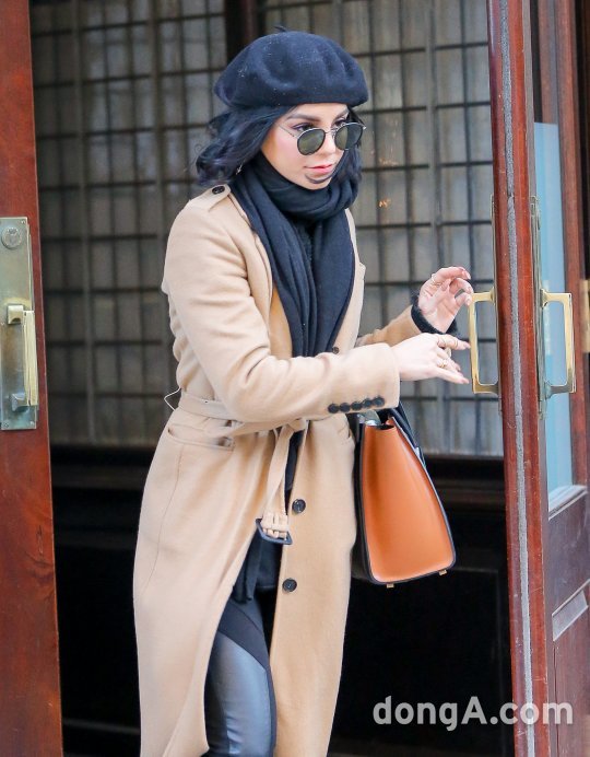 이날 바네사 허진스는 레트로한 선글라스에 검정색 베레모와 스카프, 카멜색 코트를 매치해 시크한 공항패션을 연출했다.