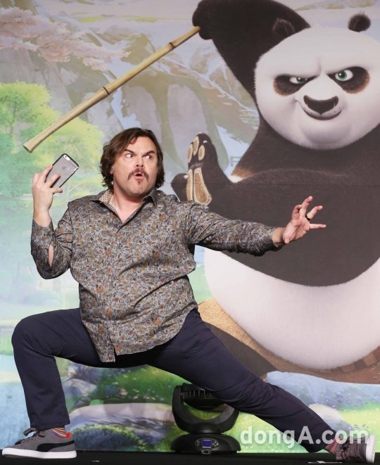 할리우드 배우 잭 블랙이 20일 오전 서울 영등포구 콘래드호텔에서 열린 영화 ‘쿵푸팬더3’ 기자회견에서 포토타임을 하고 있다.
