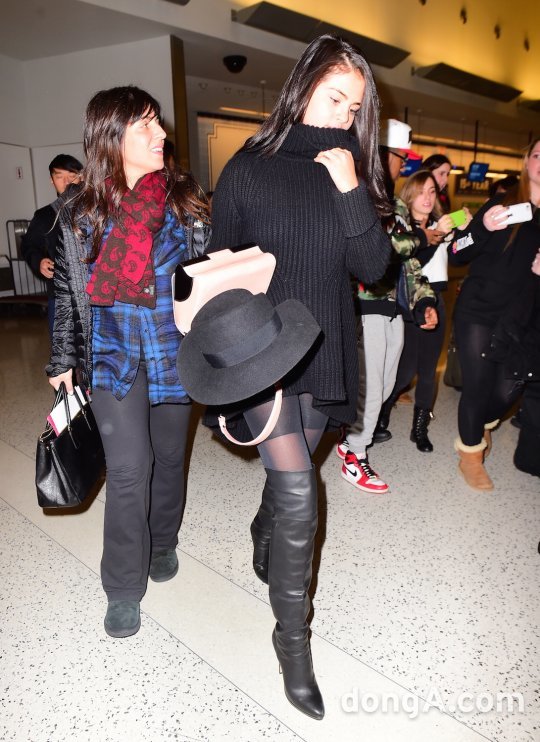 이날 셀레나 고메즈는 벌키한 니트를 원피스 처럼 연출하고, 사이하이(thigh high) 부츠를 착용해 시크한 올블랙 공항패션을 완성했다.