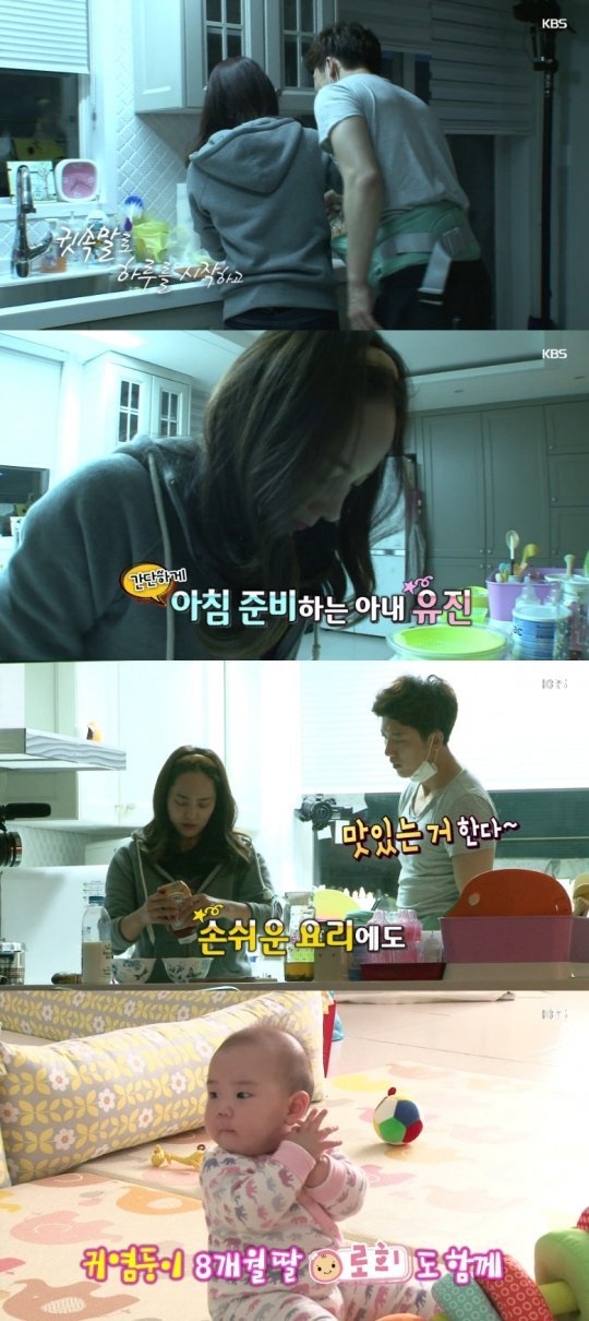 이 영상에서 기태영은 아침에 깨자마자 딸 로희를 위한 아기띠를 메고 나타나 식사를 준비 중인 유진에게 귓속말을 하며 닭살 부부의 모습을 보여줬다.