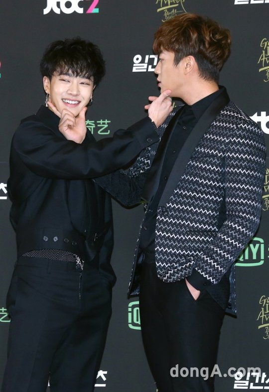 비스트의 멤버 이기광(왼쪽), 윤두준이 21일 오후 서울 동대문구 경희대학교 평화의 전당에서 열린 ‘골든디스크 시상식’에 참석해 포토타임을 하고 있다.