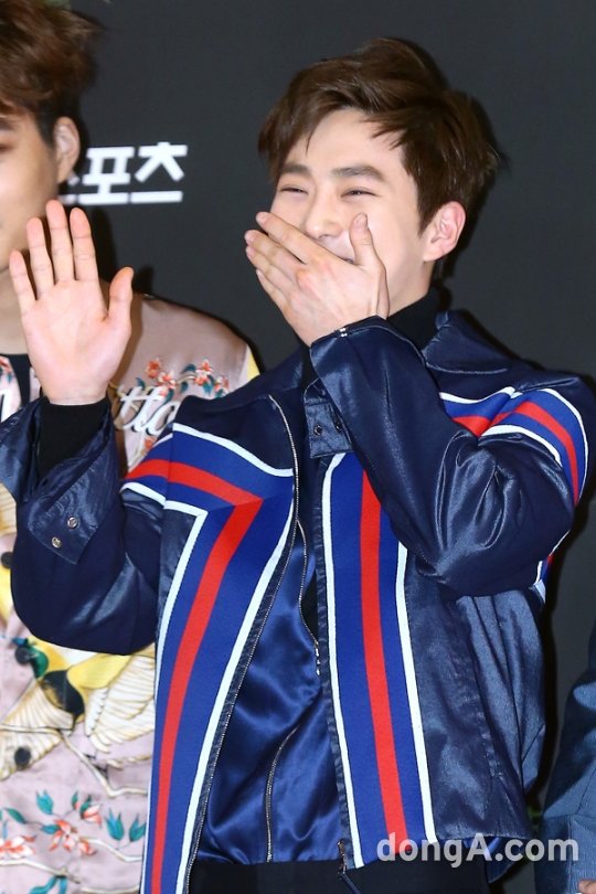 엑소의 멤버 수호가 21일 오후 서울 동대문구 경희대학교 평화의 전당에서 열린 ‘골든디스크 시상식’에 참석해 포토타임을 하고 있다.
