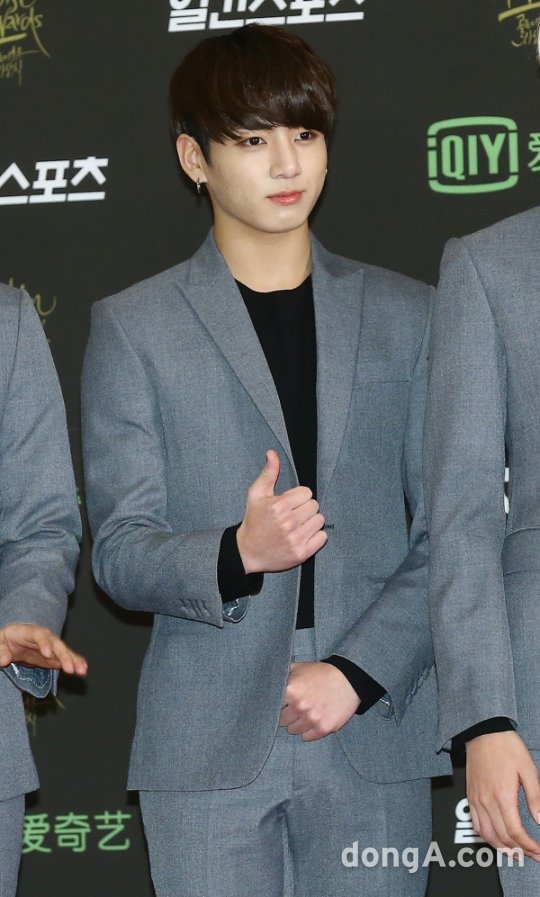 방탄소년단의 멤버 정국이 21일 오후 서울 동대문구 경희대학교 평화의 전당에서 열린 ‘골든디스크 시상식’에 참석해 포토타임을 하고 있다.