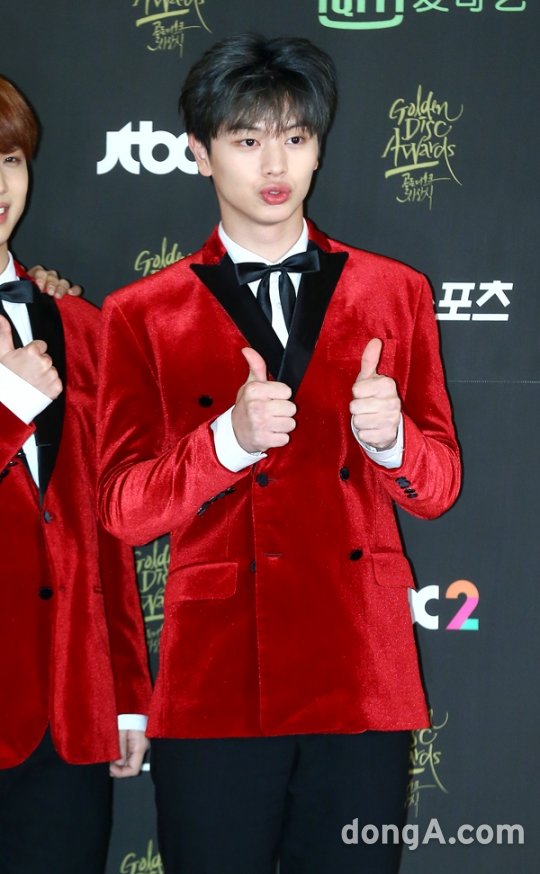 비투비의 멤버 육성재가 21일 오후 서울 동대문구 경희대학교 평화의 전당에서 열린 ‘골든디스크 시상식’에 참석해 포토타임을 하고 있다.