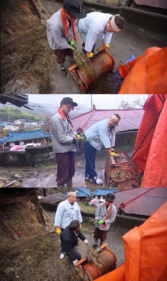현주엽과 주우재는 함께 콩 털기 작업에 착수했다.
