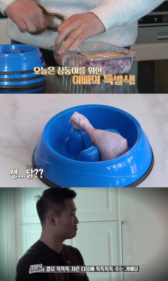 23일 방송된 채널A ‘개밥 주는 남자’에서는 삼둥이 대·중·소가 생닭을 폭풍 흡입하는 장면이 방송됐다.