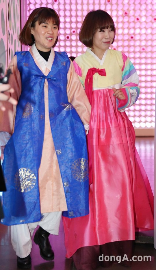 개그우먼 박지선(왼쪽)과 오나미가 23일 오전 서울 여의도 63컨벤션센터에서 열린 박영진 결혼식에 참석하고 있다.