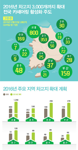 그린카는 2016년말까지 전국 약 1100개의 차고지를 추가로 확보해 총 3000개소 돌파를 목표로 삼았다. 특히 수도권 이외의 지역에 약 550개의 차고지를 신설, 기존에 서울 및 수도권 지역이 중심이었던 서비스를 전국적으로 활성화할 계획이다. 특히 롯데하이마트, 롯데백화점, 롯데마트 등 전국 유통망을 보유한 롯데그룹 계열사와 협업을 통해 약 400개의 차고지를 운영할 계획이다. 방문고객과 인근 주민 및 매장 직원들이 쇼핑, 여행, 업무용의 목적으로 서비스를 이용할 수 있다. 그린카는 지난해 서비스의 핵심요소인 차고지 수를 지속적으로 확대해 고객접근성을 높여왔다. 2014년 1050개에서 한 해 동안 800개 이상의 차고지를 늘려 2015년 말 국내 최다 규모인 1900여개의 차고지를 확보, 국내 1위 카셰어링 서비스망을 구축했다.