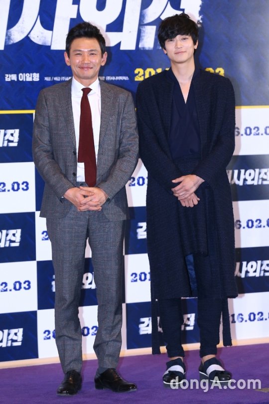 배우 황정민(왼쪽), 강동원이 25일 오후 서울 강남구 코엑스 메가박스에서 열린 ‘검사외전’ 언론시사회에 참석해 포토타임을 하고 있다.