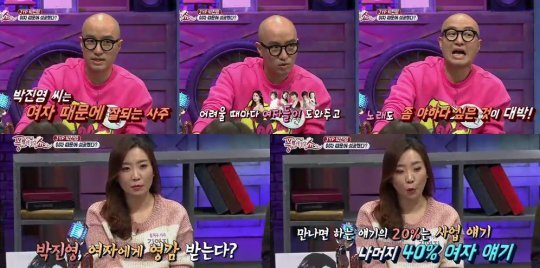 이에 한 기자는 “실제로 박진영은 여자에게 영감을 잘 받는다”며 홍석천의 의견을 뒷받침했다. 그는 “박진영은 절친인 배용준과 만나도 대부분의 시간을 여자 얘기 하는데 할애한다”고 밝혀 패널들을 놀라게 했다.