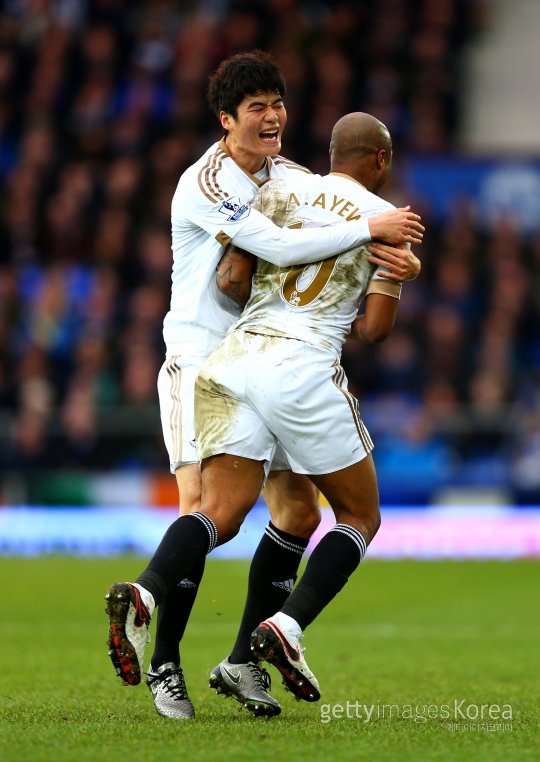 스완지시티 기성용(왼쪽)이 24일(한국시간) 벌어진 에버턴과의 원정경기에서 전반 34분 결승골을 터트린 팀 동료 안드레 아예우를 끌어안고 기쁨을 나누고 있다. 사진=ⓒGettyimages멀티비츠