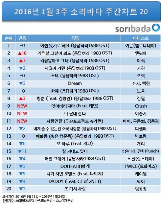온라인 음원 포털 소리바다(대표 양정환, www.soribada.com)는 멜로디데이의 여은이 부른 응팔 OST ‘이젠 잊기로 해요’가 지난주에 이어 1월 3주차(1월18일~1월24일) 주간차트에서 1위를 차지하며 2주 연속 정상을 지켰다고 밝혔다.