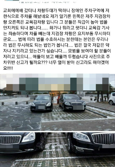 한 신도는 "교회에 예배 갔더니 차량 두대가 떡하니 장애인 주차구역에 주차를 해놨네요. 왼쪽은 지검장 차량이고 오른쪽은 교육감 차량입니다. 화가나서 뭐라고 했더니 교육감 기사는 죄송하다며 차를 빼는데 지검장 차랑은 요지부동 무시하더라"라며 SNS를 통해 고발했다.