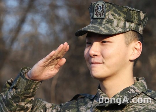 배우 윤시윤이 27일 오전 경기 인천 해병대 2사단에서 군생활을 마친 뒤 거수경계를 하고 있다.
