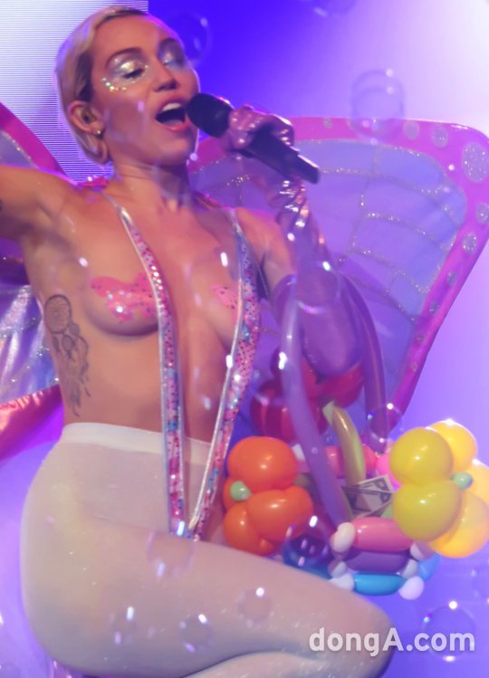 마일리 사이러스는 흰색타이즈를 입고 나비모양 스티커로 주요 부위를 가린 채 등장했다.