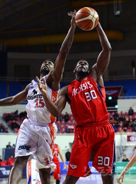 모비스 커스버트 빅터(오른쪽)가 27일 울산동천체육관에서 열린 전자랜드와의 홈 경기에서 상대 리카르도 포웰과 볼을 다투고 있다. 모비스는 낙승을 거두며 하루만에 공동 1위에 복귀했다. 울산|김종원 기자 won@donga.com