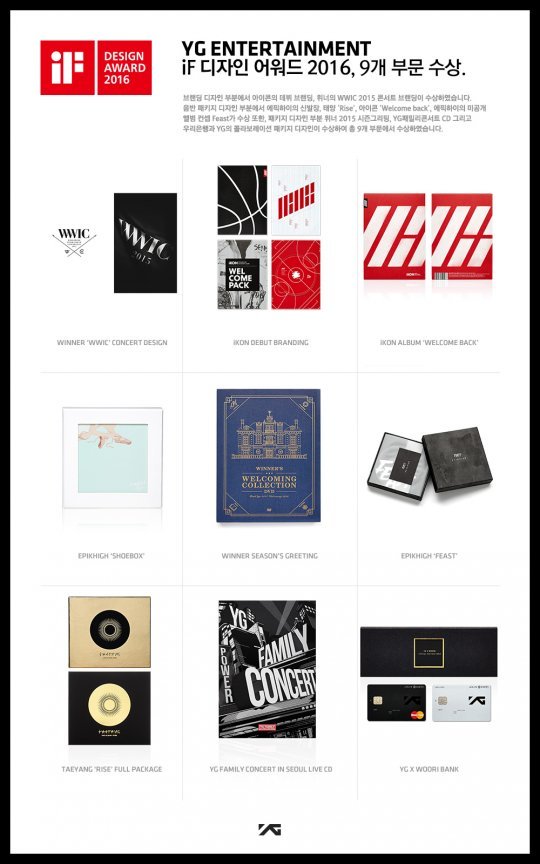 YG 디자인랩은 EPIK SHOBOX 앨범 패키지 디자인, EPIK HIGH ‘FEAST’ 앨범 패키지 디자인 , TAEYANG 2ND ALBUM RISE 앨범 패키지 디자인, iKON ALBUM WELCOME BACK 앨범 패키지 디자인, iKON DEBUT BRANDING 브랜딩 디자인, WINNER WWIC 2015 CONCERT 브랜딩 디자인, YG FAMILY CONCERT LIVE CD 패키지 디자인, WINNER SEASON’S GREETING DVD 패키지 디자인, YG X WOORI BANK 패키지 디자인 등 ‘앨범 디자인’, ‘브랜딩 디자인’, ‘패키지 디자인’ 부문에서 총 9관왕의 쾌거를 이뤘다.
