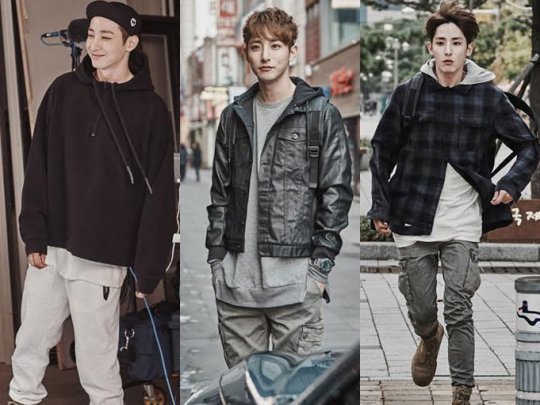 그는 스냅백과 후드티셔츠, 트레이닝복으로 이른바 ‘동네 추리닝’ 패션을 선보이는가 하면, 후드티에 체크남방을 레이어드 하고 카고바지와 매치하는 등 ‘동네 오빠 패션’을 유감없이 보여준다.