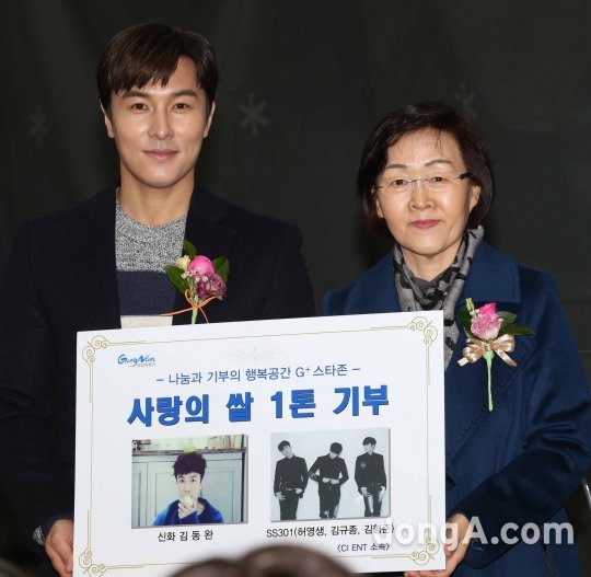 가수 김동완(왼쪽)과 신연희 강남구청장이 29일 오후 서울 강남구 압구정로데오거리역사에서 열린 G+ 스타존 시즌5 오프닝 행사에 참석해 포토타임을 하고 있다.