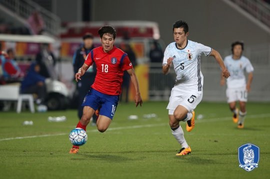 경기 시작 직후 주도권을 손에 넣은 한국은 20분 만에 행운의 선취골을 기록했다. 왼쪽 측면에서 심상민(서울)이 높게 크로스한 볼을 문전에 있던 진성욱(인천)이 헤딩으로 떨어뜨렸다. 이를 권창훈(수원)이 발리슛으로 연결했고, 볼은 일본 수비수 다리에 맞고 굴절돼 골대 안으로 빨려들었다. 한국은 이후에도 볼 점유율을 높여 일본을 효과적으로 상대하며 전반을 1-0으로 마쳤다.