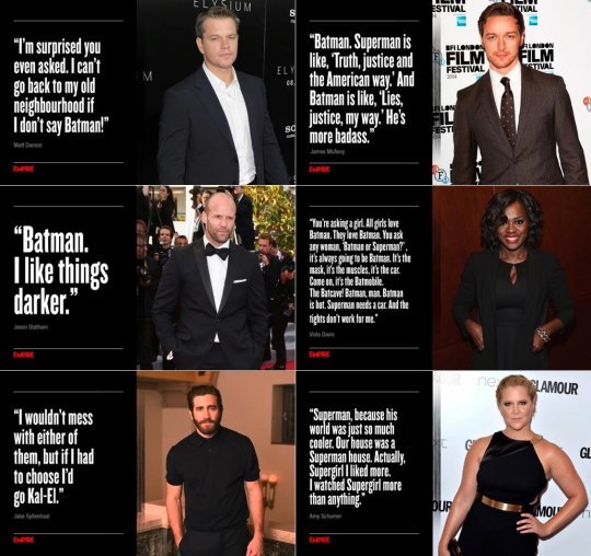 영국 엠파이어 매거진이 배우들에게 “배트맨과 슈퍼맨의 대결에서 누가 이길 것 같은지”를 묻는 질문에 우선 배트맨을 지지하는 쪽이 우세했다. ‘배트맨 대 슈퍼맨: 저스티스의 시작’에서 배트맨 역할을 맡은 벤 애플렉과의 친분으로 유명한 맷 데이먼은 “나한테 묻다니 놀랐다. (벤 에플렉과 같이 놀던) 옛날 동네에 다시 가려면 당연히 배트맨이라고 해야지”라며 위트 있게 답했다.