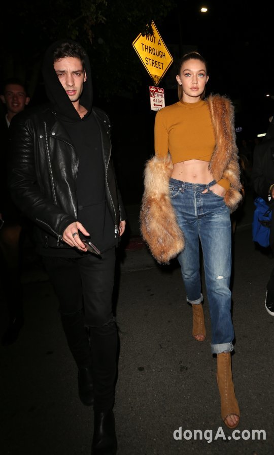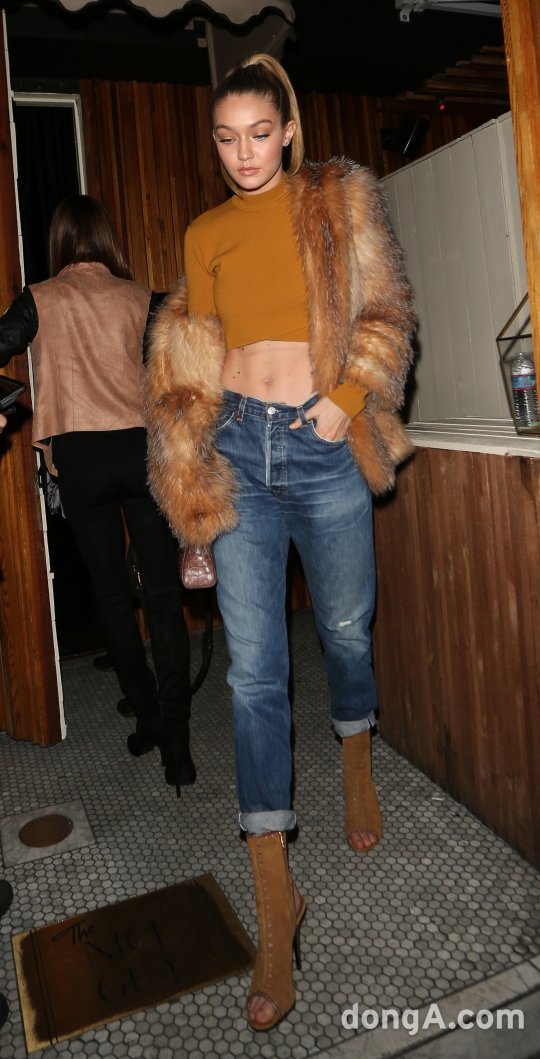 지지 하디드는 카멜색 크롭탑과 퍼 자켓, 보이프렌드 팬츠를 매치해 시크한 클럽룩을 완성했다.