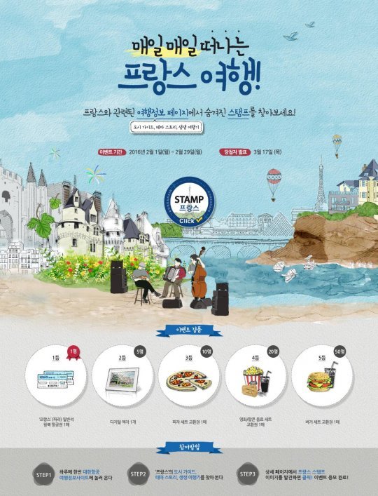 대한항공은 2월 여행정보사이트(travel.koreanair.com) 방문자를 대상으로 ‘매일매일 떠나는 프랑스 여행’ 이벤트를 실시한다. 1월부터 진행 중인 ‘게스트하우스 프랑스’ 입주자 모집 이벤트와 함께 진행되는 행사로 여행정보사이트를 방문하여 프랑스의 도시 가이드,테마 스토리,생생 여행기 등의 메뉴에 숨겨진 스탬프를 발견하면 응모할 수 있다. 1등에게 프랑스(파리) 일반석 왕복 항공권 1매를 제공한다.