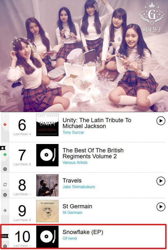 3일 오전 업데이트된 빌보드 월드앨범차트에 따르면 여자친구의 세 번째 미니앨범 '스노플레이크(Snowflake)'는 10위를 차지했다. 해당 차트는 미국 외에서 발매된 세계 모든 음반의 판매고를 기준으로 정해지는 순위다.