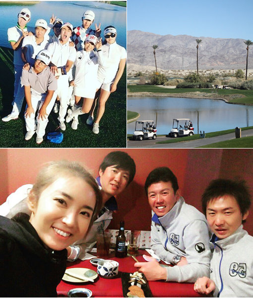 전지훈련 중 동료들과 연습경기를 마친 뒤 기념사진을 남겼다. 미국 팜스프링 테라라고 골프장 전경 사진과 캐디, 트레이너와 함께 하는 즐거운 식사시간(왼쪽 위부터 시계방향). 사진제공|프로골퍼 이보미