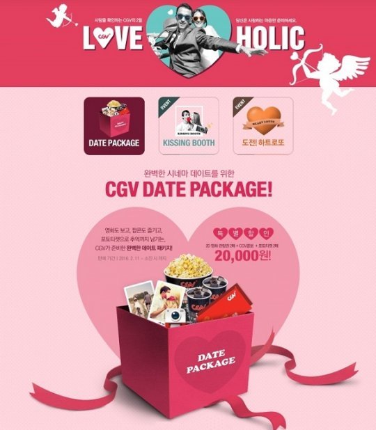 먼저 온라인과 모바일에서 1만원 가량 할인효과를 볼 수 있는 'CGV데이트패키지'를 2만 세트 한정 수량 판매한다. 일반영화관람권과 포토티켓 각 2매, CGV 콤보교환권을 묶어 2만원에 만나볼 수 있다. 데이트패키지는 온라인과 모바일을 통해 오는 3월말까지 예매 및 사용 가능하다.