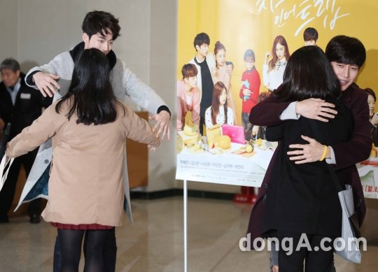 배우 남주혁(왼쪽)과 박해진이 12일 오후 서울 숙명여자대학교 백주년기념관에서 열린 프리허그 게릴라 이벤트에서 팬들과 즐거운 시간을 보내고 있다.