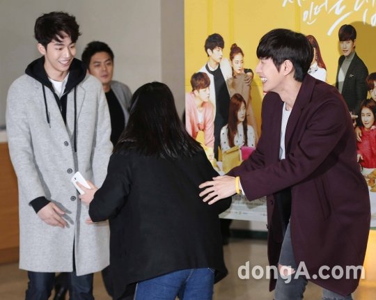 배우 남주혁(왼쪽)과 박해진이 12일 오후 서울 숙명여자대학교 백주년기념관에서 열린 프리허그 게릴라 이벤트에서 팬들과 즐거운 시간을 보내고 있다.