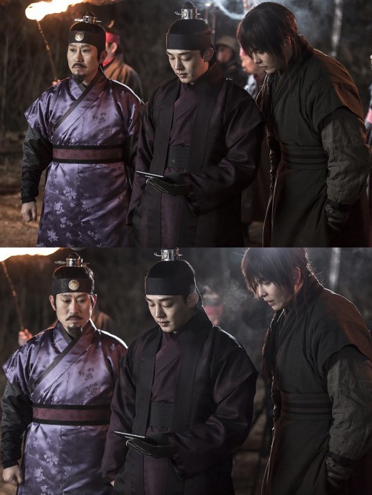 13일 ‘육룡이 나르샤’ 측은 촬영장 사진을 공개했다. 사진은 이방원(유아인)이 관리와 유생들이 숨어 든 두문동에 불을 지르는 장면이다. 이방원 역의 유아인, 호위무사 무휼 역의 윤균상, 책사 하륜 역의 조희봉이 나란히 서 있다.