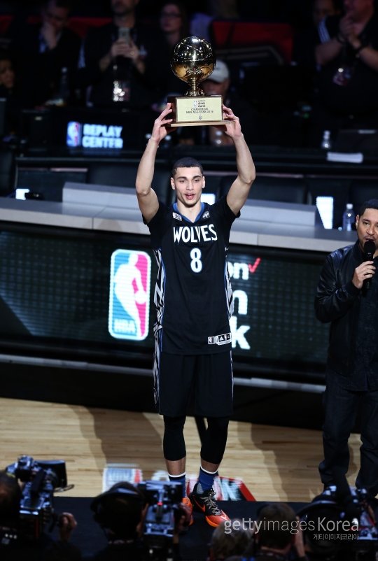 미네소타의 잭 라빈이 14일(한국시간) 토론토 에어캐나다센터에서 열린 미국프로농구(NBA) 올스타전 덩크슛 콘테스트에서 2년 연속 챔피언을 차지한 뒤 트로피를 들고 팬들의 환호에 답하고 있다. 사진=ⓒGettyimages멀티비츠