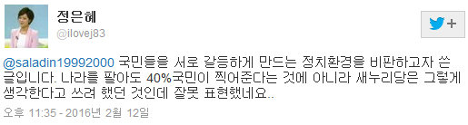 이어 정 부대변인은 “나라를 팔아도 40% 국민이 찍어준다는 것이 아니라 새누리당은 그렇게 생각한다고 쓰려 했던 것인데 의도와 달리 잘못 표현했다”고 덧붙였다.