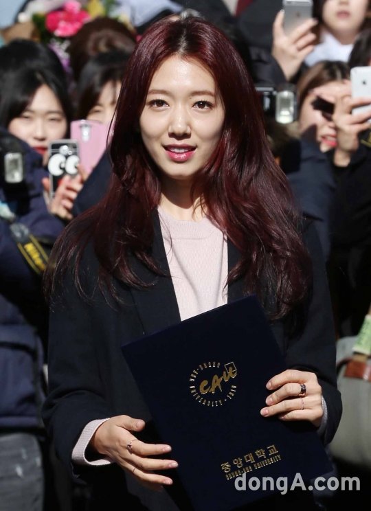 배우 박신혜가 15일 오후 서울 중앙대학교 흑석캠퍼스 중앙문화예술관 대극장에서 열린 학위수여식에 참석하기 전에 포즈를 취하고 있다.