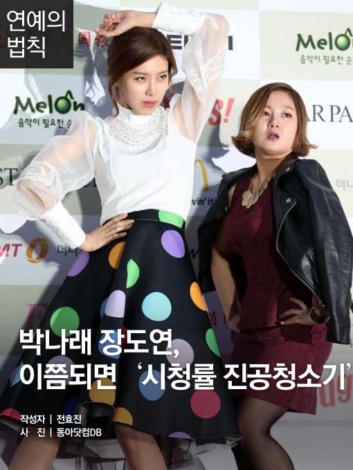 KBS 공채 개그맨 선후배인 두 사람은 단신과 장신이라는 신체 매력을 살려 ‘개그콘서트’와 tvN ‘코미디 빅리그’에서 맹활약했다. 박나래의 경우 ‘코미디 빅리그’에서 싱크로율 높은 분장으로 주목받기 시작, MBC ‘무한도전-바보전쟁’을 기점으로 대세 개그우먼이 됐다. 장도연은 tvN에서 ‘롤러코스터’ ‘미생물’ ‘콩트앤더시티’ 등에 출연하며 CJ의 딸로 부상했다.
