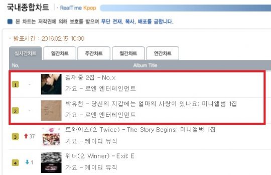 씨제스 엔터테인먼트는 “오늘(15일) 오전 10시 기준, 음반 판매량 집계 사이트인 한터정보시스템의 실시간 앨범 판매량 차트에서 김재중과 박유천이 각각 1, 2위를 차지했다. 군 복무 중임에도 불구하고 두 아티스트에 대한 국내외 팬들의 뜨거운 반응이 이어지며 이 같은 결과를 이뤄냈다.”고 전했다.