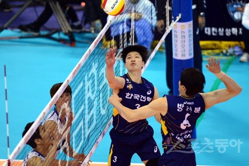 한국전력 강민웅(오른쪽 2번째)이 지난달 29일 대전 충무체육관에서 벌어진 삼성화재와의 원정경기 도중 속공을 위한 토스를 시도하고 있다. 스포츠동아DB