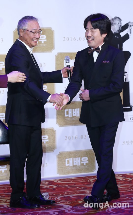 배우 이경영(왼쪽), 오달수가 17일 오후 서울 광진구 건대입구 롯데시네마에서 열린 영화 ‘대배우’ 제작발표회에 참석해 기자간담회를 하고 있다.